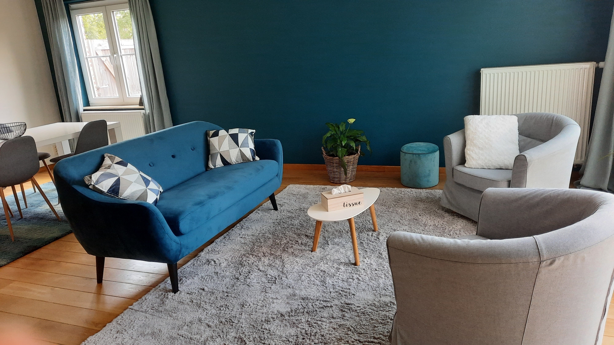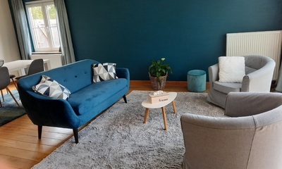 De praktijk is gevestigd in een halfopen bebouwing. Alle kamers zijn smaakvol ingericht en scheppen een warme sfeer van rust en vertrouwen. Naast de individuele gespreksruimtes is er nog een massageruimte en een groepsruimte. Deze laatste ruimte grenst aan de lichtrijke veranda en aan de groene tuin. Er is tevens een terras en lounge aanwezig, die ook gebruikt mogen worden. De gedeelde ruimtes bestaan uit een inkomhal, een wachtruimte, een opbergruimte en 2 toiletten en 2 ingerichte keukens (2 microgolfovens, 2 vaatwassers en 1 ijskast zijn aanwezig).